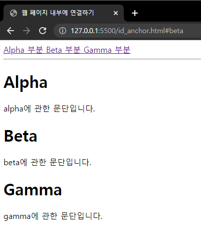 ㅁ 웹 페이지 내 특정 태그로 이동하려면 id 속성을 추가로 사용해야 합니다. h1 태그에 id 속성을 넣고 a 태그의 href 속성에 ‘#id 속성’ 형태의 문자열을 넣는다. 파일을 실행하고 알파 부분 링크를 클릭하면 이 콘텐츠로 이동합니다.