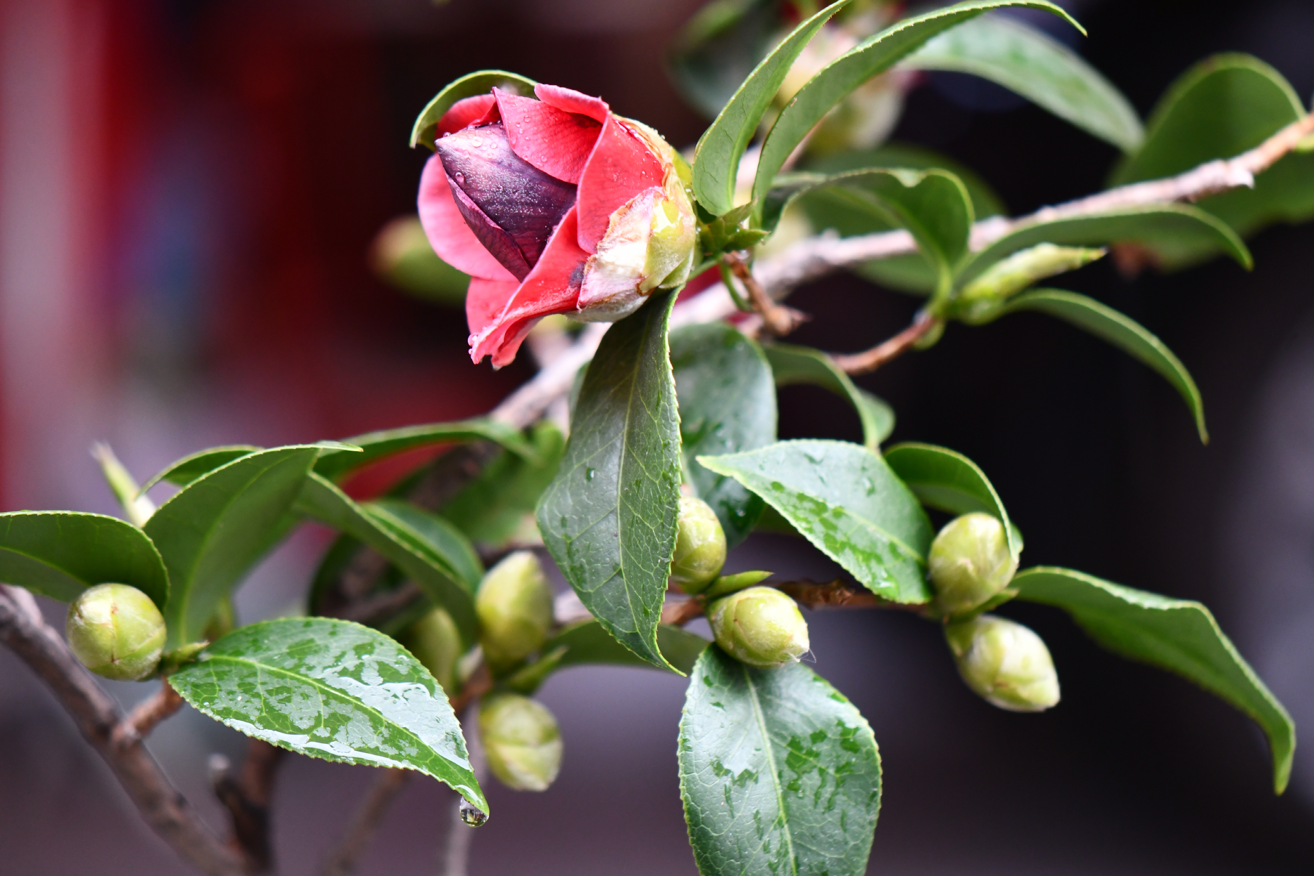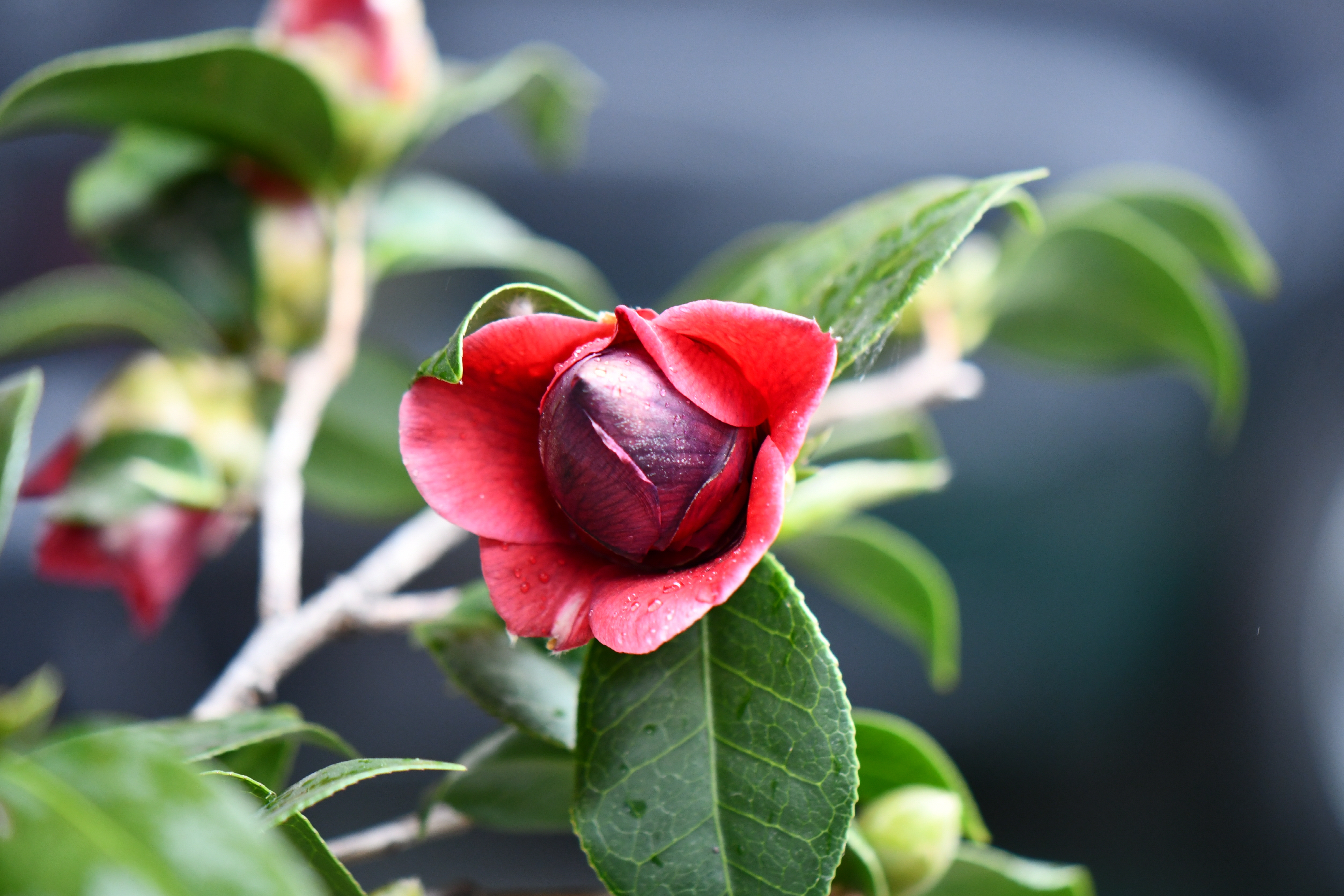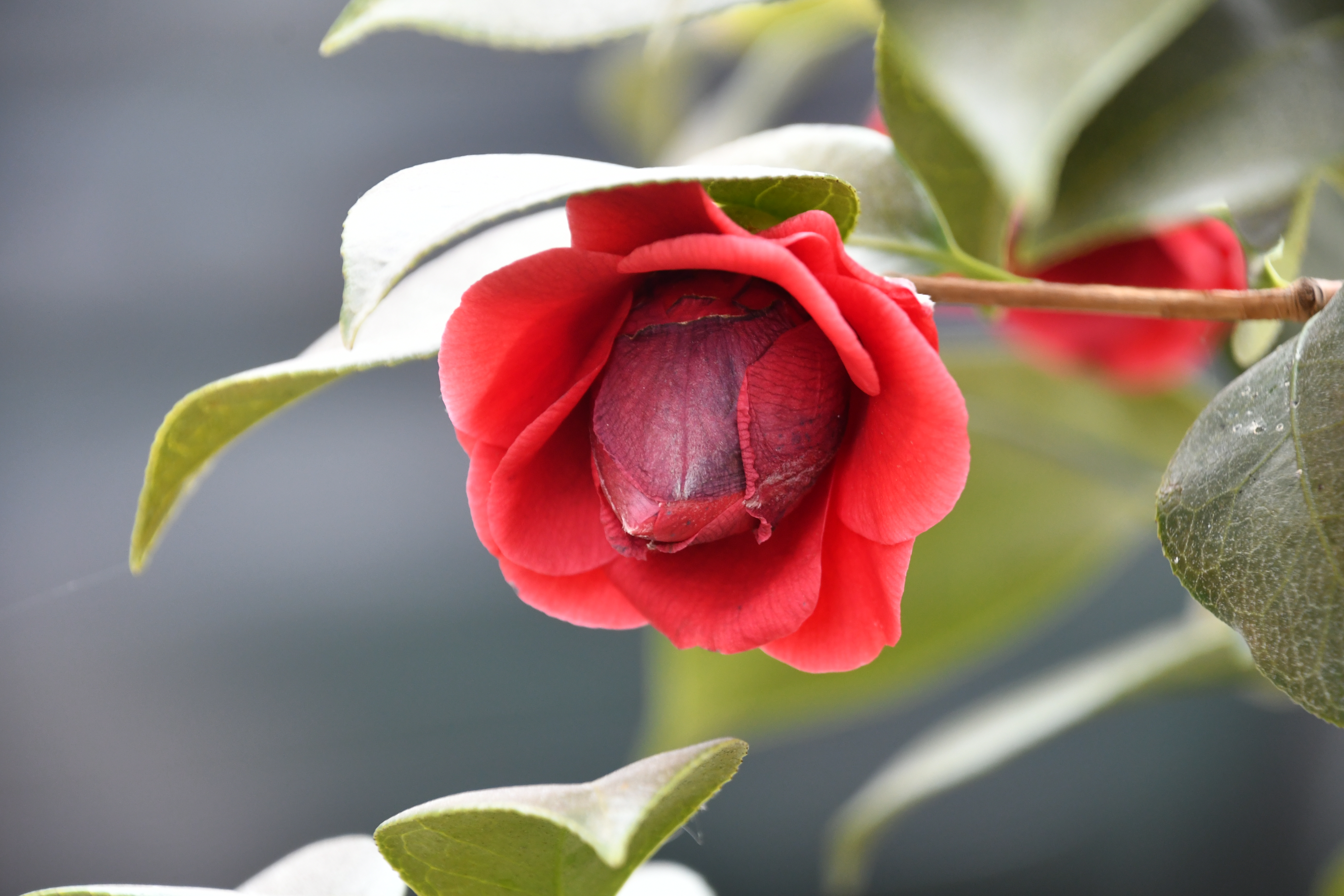 – 화분에 동백꽃이 피었습니다. 빨간색이지만 화려하지 않습니다.