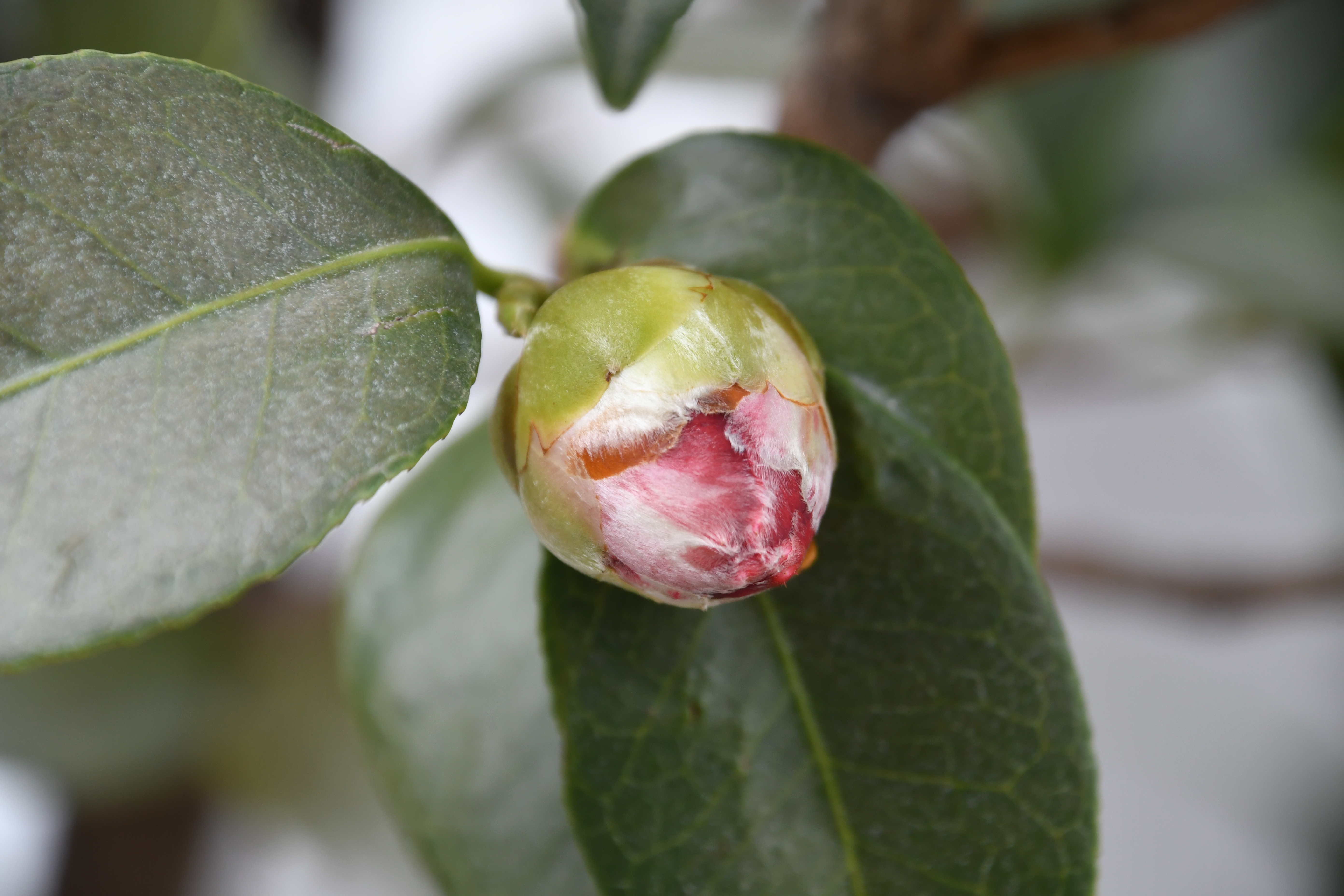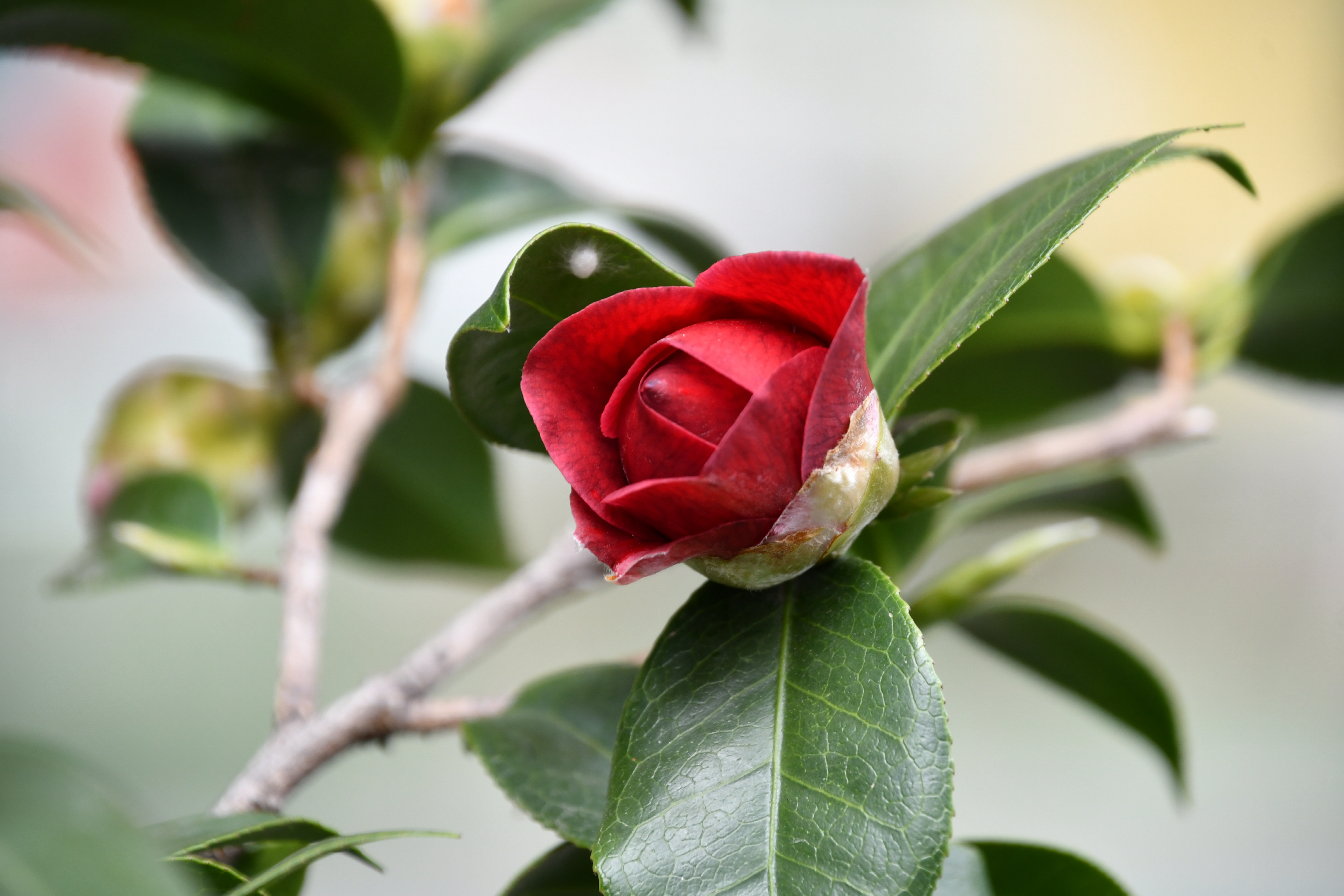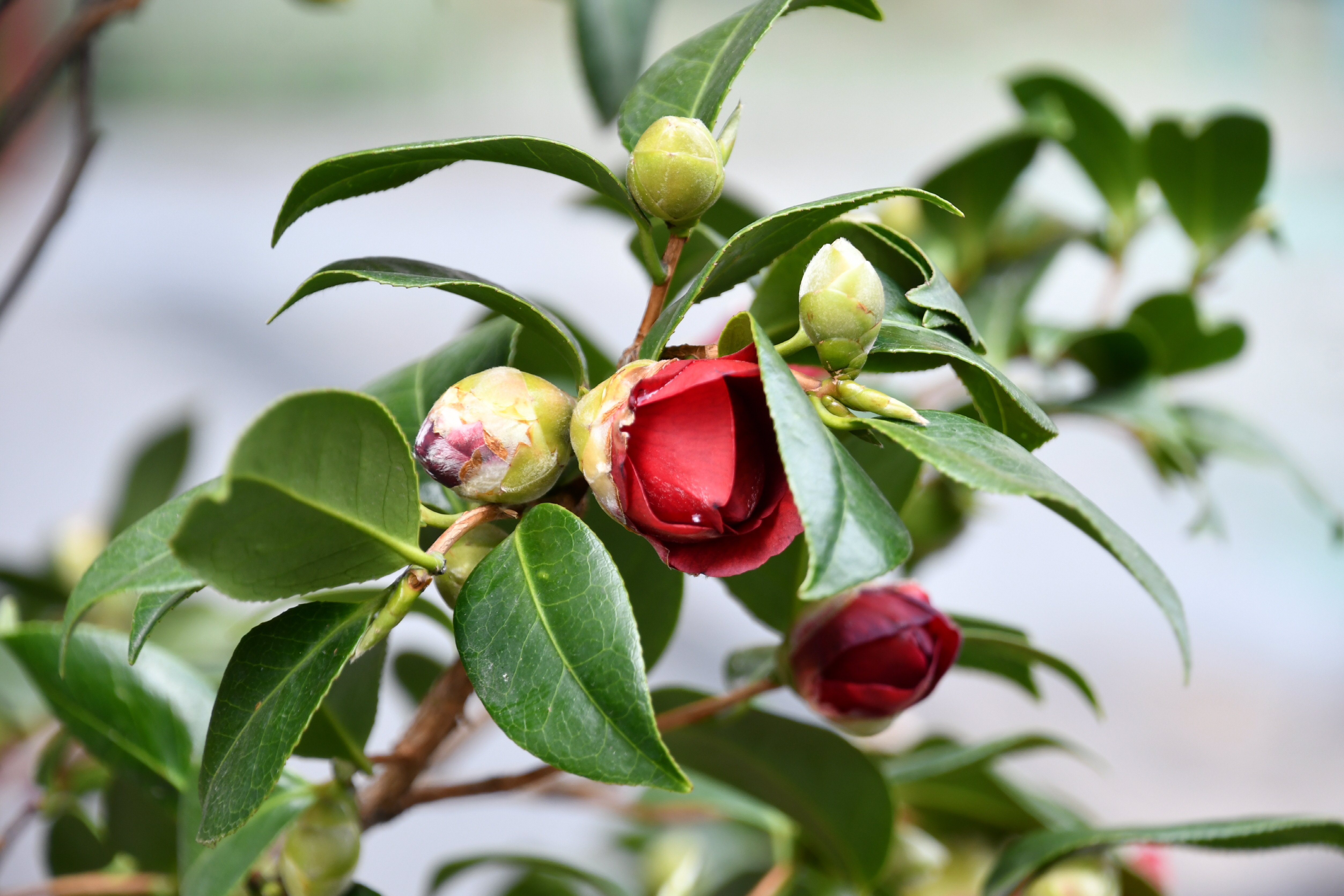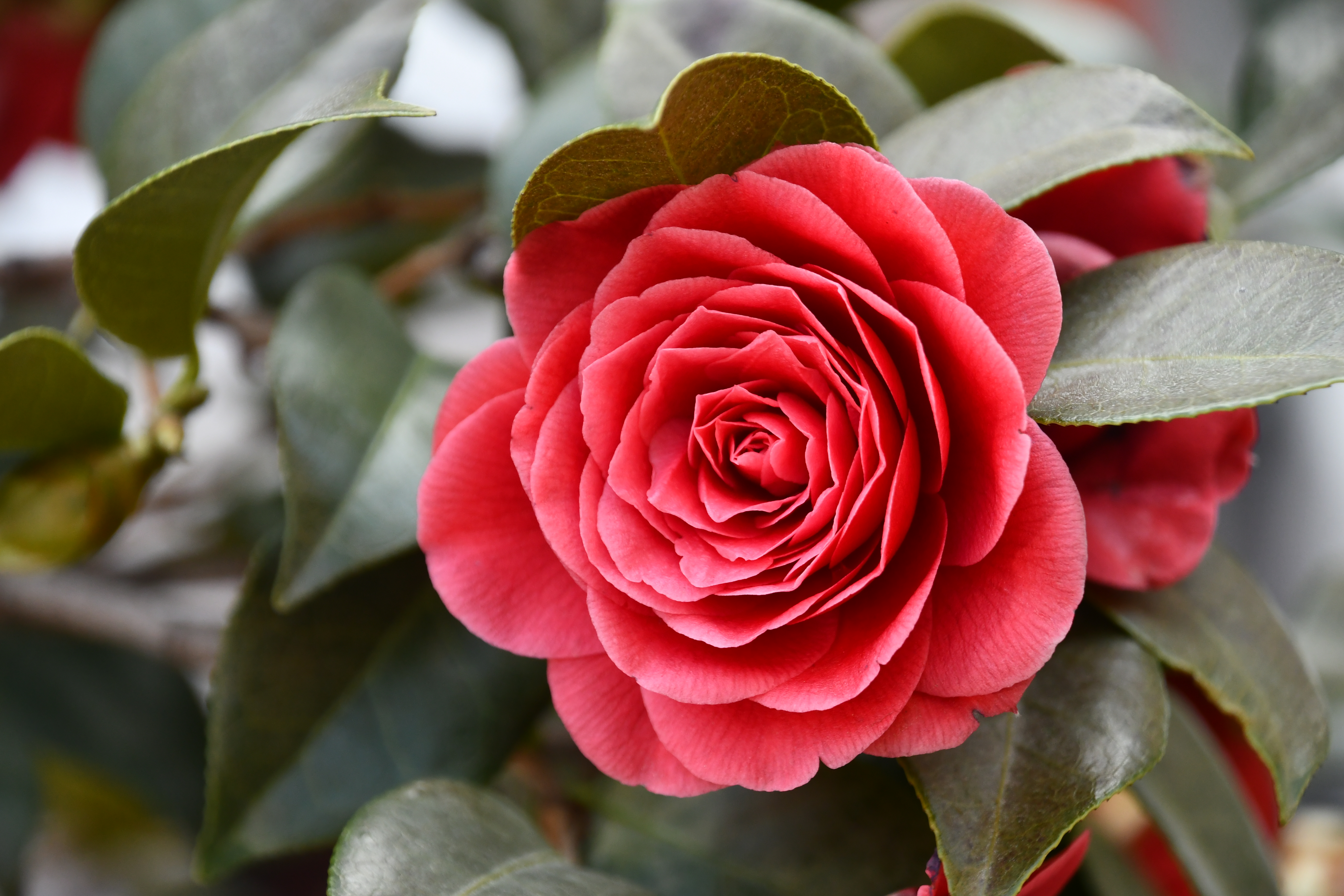 – 화분에 동백꽃이 피었습니다. 빨간색이지만 화려하지 않습니다.