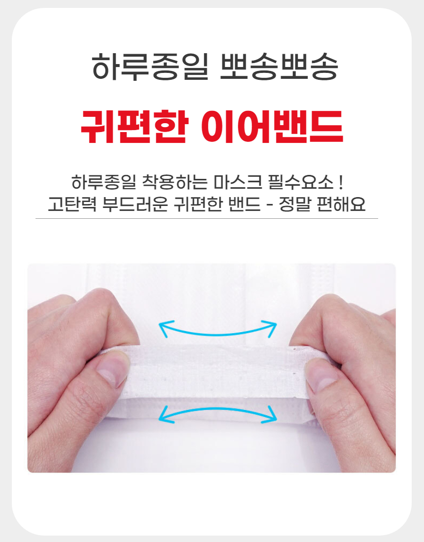 끈부분…. 이렇게 깔끔한 한국산 마스크도 있나요? 대부분 개별 포장되어 있지만 마스크를 꺼낸 상태에서도 끈이 항상 보입니다. 줄을 끊고 가볍게 당겨도 되지만, 위의 영상을 보시면 이별줄을 끊는 장면을 참고하실 수 있습니다.